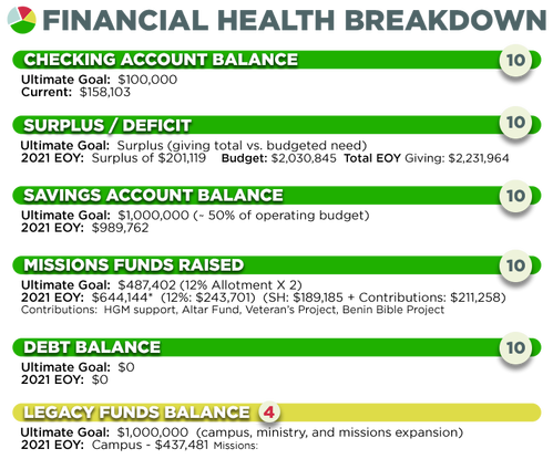 Despite this being a year of financial uncertainty for many, people continued to give faithfully. We've received around $2,200,000 in tithes and offerings and $650,000 in mission funds.